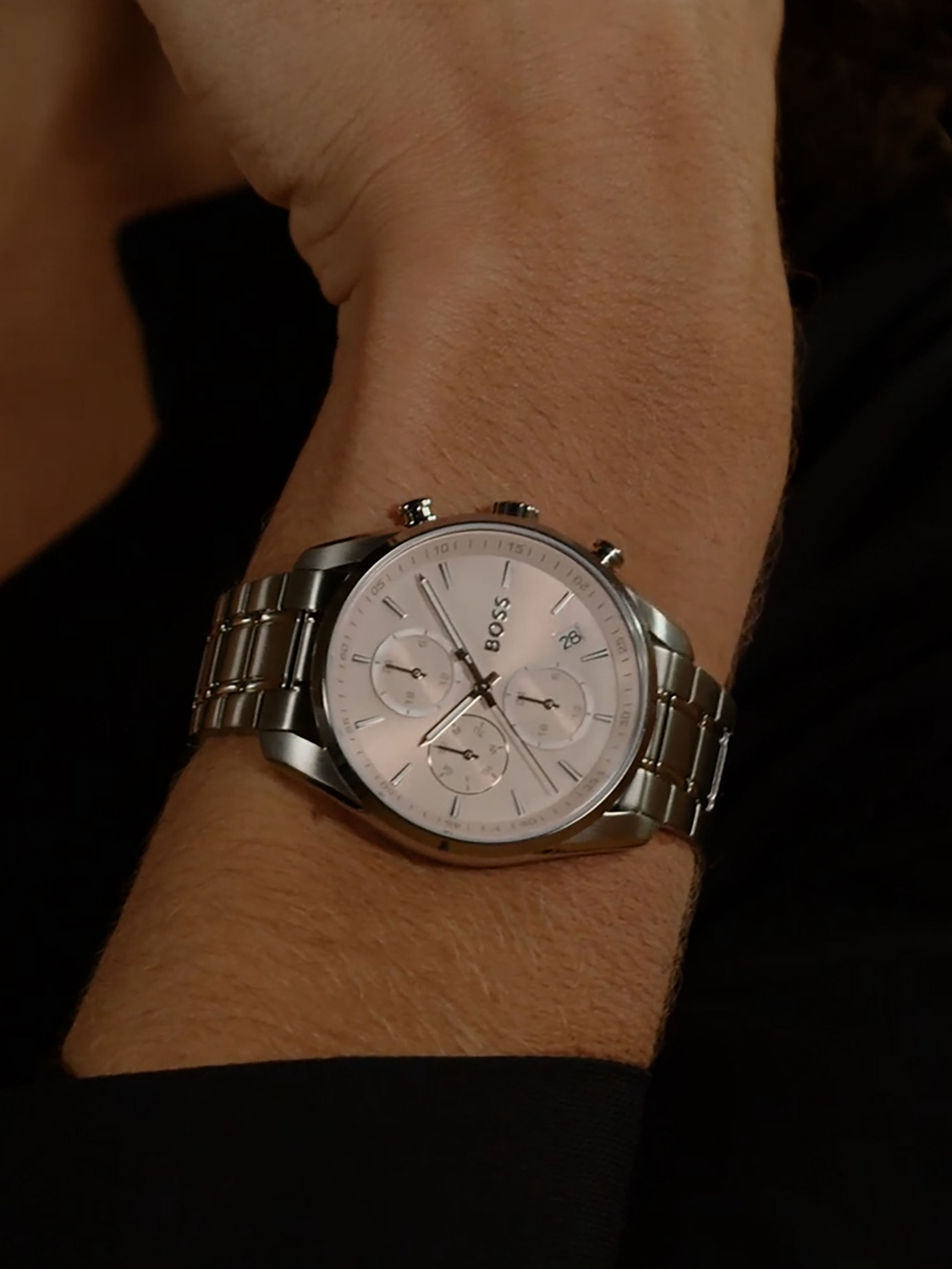 Часы Boss — это элегантная модель хронографа со светло-розовым циферблатом, на котором размещены три дополнительных циферблата и указатель даты между 4 и 5 часами. Серебристые индексы и стрелки придают часам изысканный вид. Корпус из полированной нержавеющей стали диаметром 38 мм идеально обрамляет циферблат. Браслет из нержавеющей стали с раскладывающейся застежкой обеспечивает надежную фиксацию на запястье. Эти часы защищены от брызг, но не подходят для плавания. Часы приводит в движение точный кварцевый механизм, который обеспечивает надежный хронометраж.