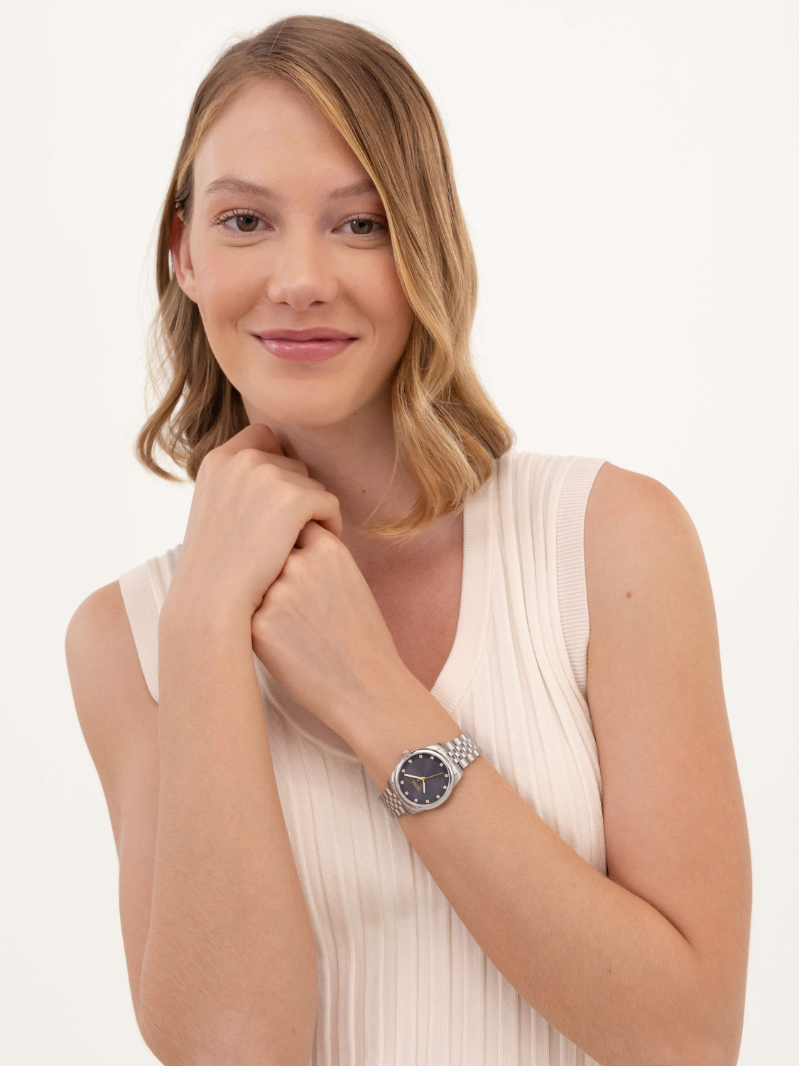 Корпус и браслет часов из нержавеющей стали. Циферблат с минеральным стеклом устойчивым к появлению царапин.