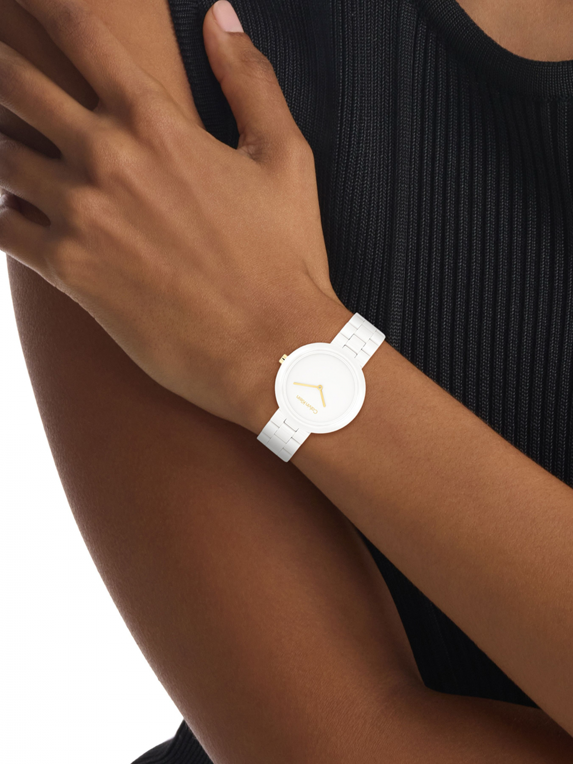 Корпус и браслет часов выполнены из керамики белого цвета.
