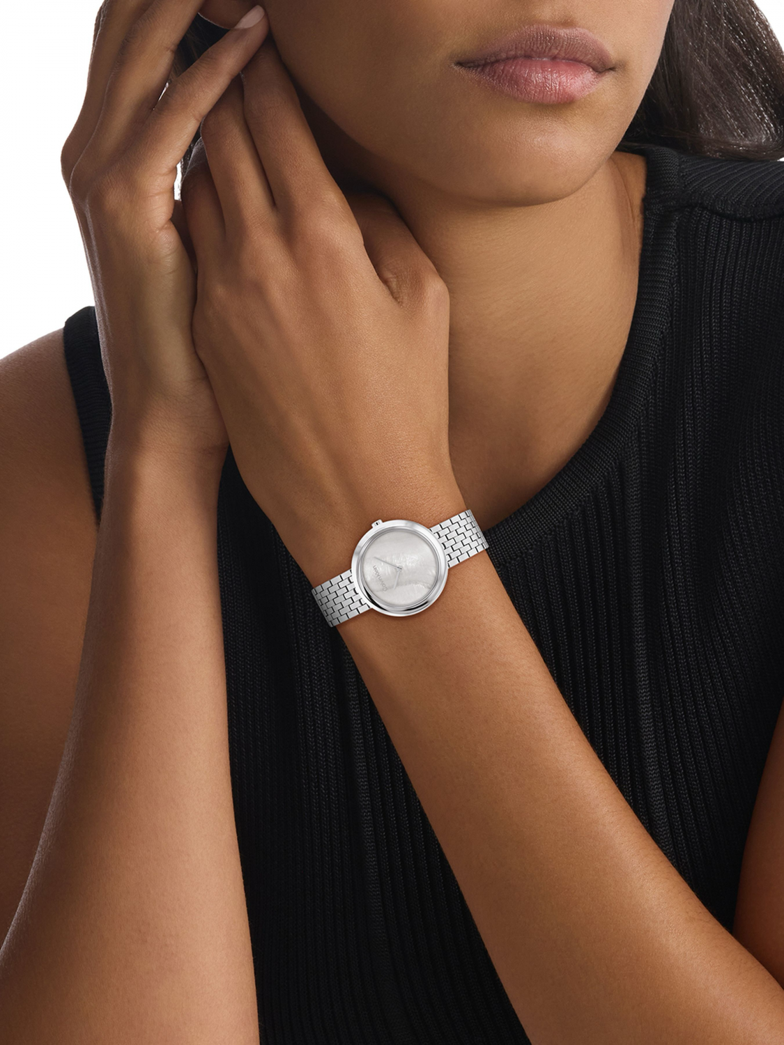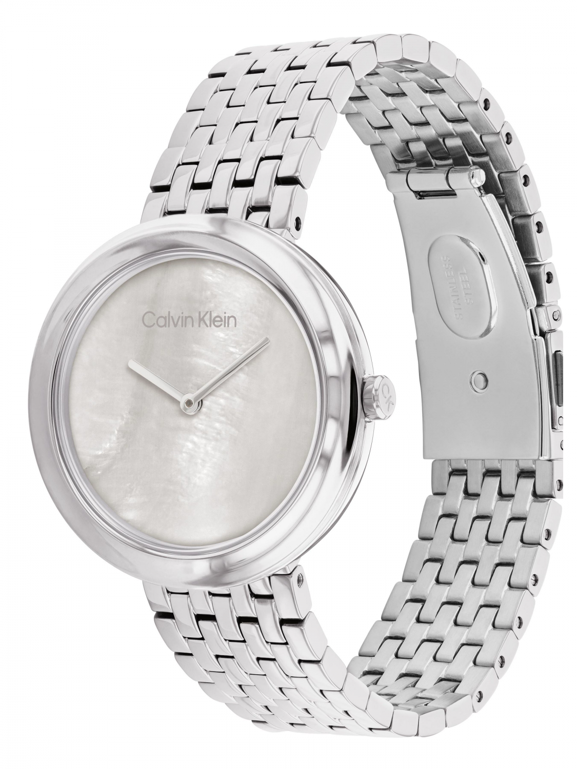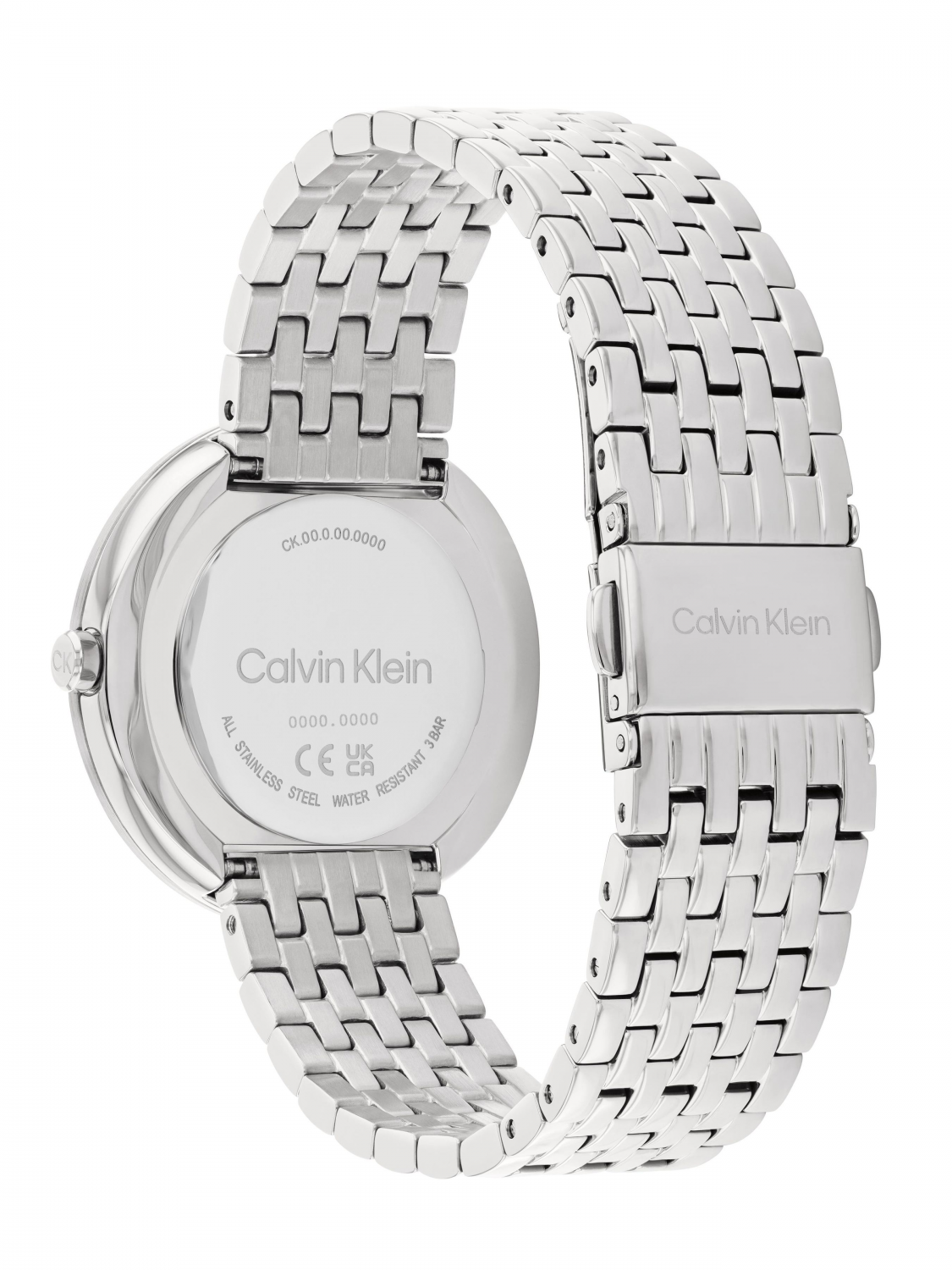 Изысканные часы, которые подчеркивают индивидуальность и стиль своей обладательницы, придавая ее образу утонченность и завершенность. Женские кварцевые часы. Полированный корпус круглой формы из нержавеющей стали. Закрученный безель. Перламутровый циферблат без меток украшен фирменным логотипом Calvin Klein и защищен минеральным стеклом. Прямоугольные стрелки в стиле Baton. Секундная стрелка отсутствует. Заводная головка украшена логотипом ''CK''. Надежный стальной браслет с раскладывающейся застежкой с двумя кнопками и логотипом бренда Calvin Klein.