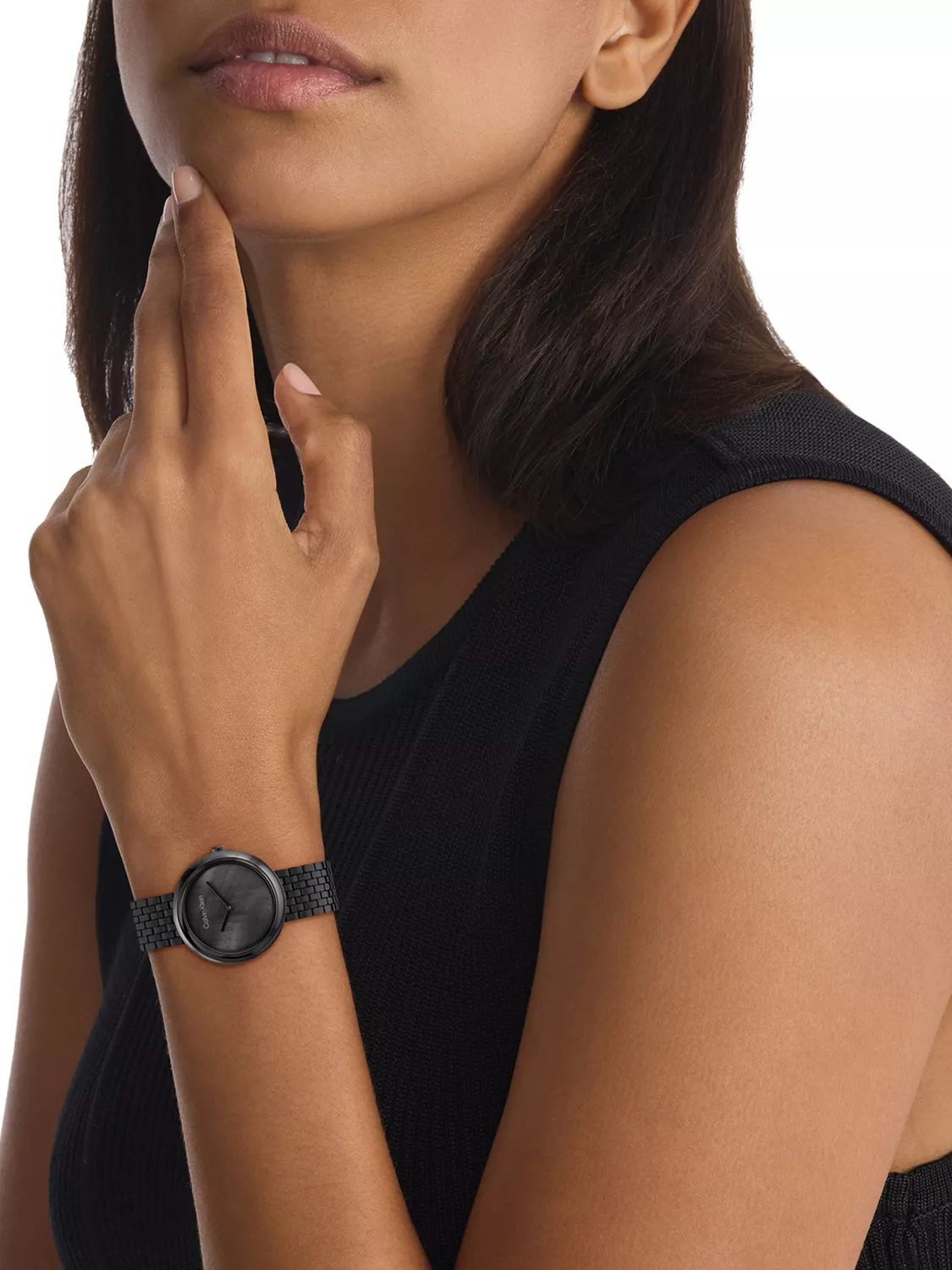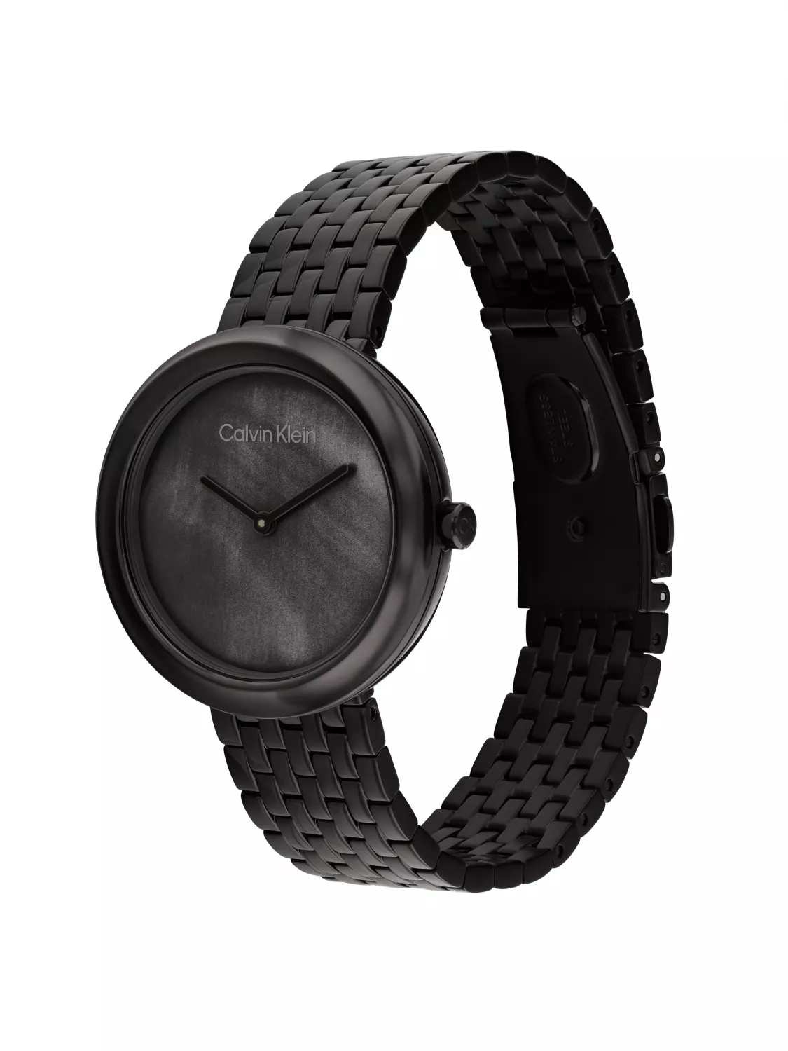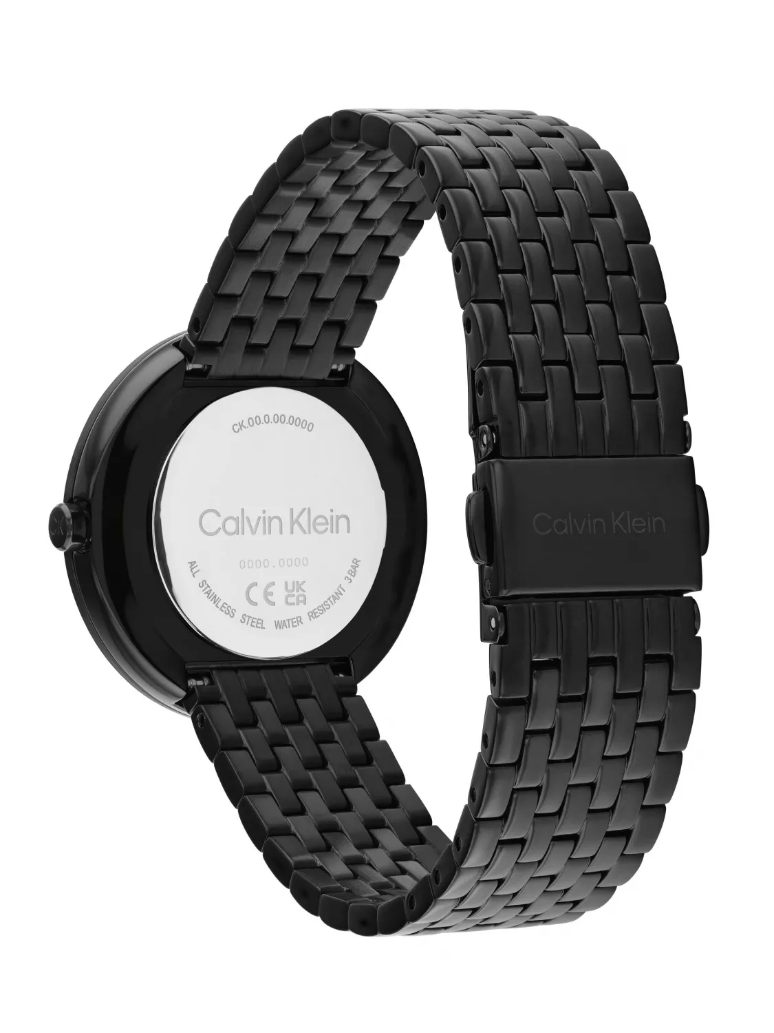 Изысканные часы, которые подчеркивают индивидуальность и стиль своей обладательницы, придавая ее образу утонченность и завершенность. Женские кварцевые часы. Корпус часов и браслет выполнены из нержавеющей стали с PVD покрытием. Циферблат черного цвета защищен минеральным стеклом. Прямоугольные стрелки в стиле Baton. Секундная стрелка отсутствует. Заводная головка украшена логотипом ''CK''. Надежный стальной браслет с раскладывающейся застежкой с двумя кнопками и логотипом бренда Calvin Klein.