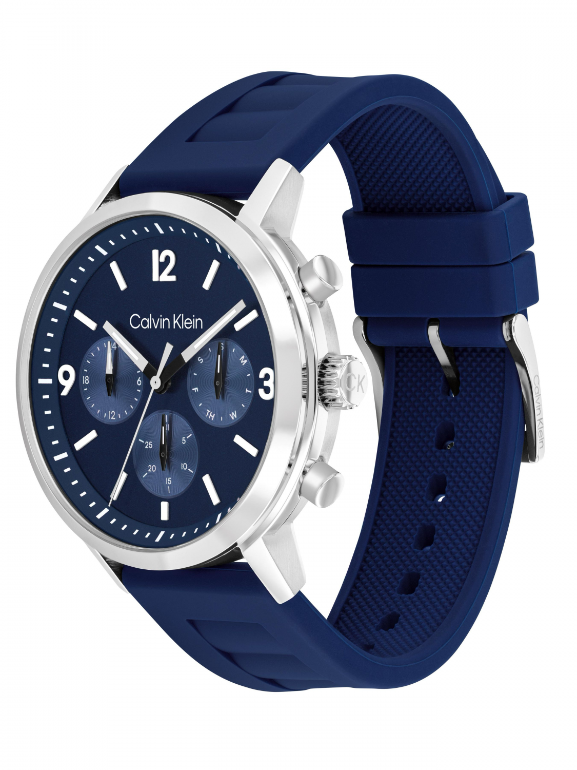 Часы Calvin Klein Gauge 25200460 — это мужская кварцевая мультифункциональная модель, сочетающая спортивный стиль и фирменный минимализм бренда. Темно-синий круглый циферблат с серебристыми стрелками и метками, защищён минеральным стеклом. На нём отображены даты, дня недели и 24-часового формата времени на трех дополнительных субциферблатах. Корпус изготовлен из нержавеющей стали. Диаметр составляет 44 мм.. Синий силиконовый ремешок с классической застежкой-пряжкой, устойчивый к влаге и удобный для повседневной носки. Водонепроницаемость 5 АТМ, выдерживают случайные брызги и дождь, но не предназначены для плавания.