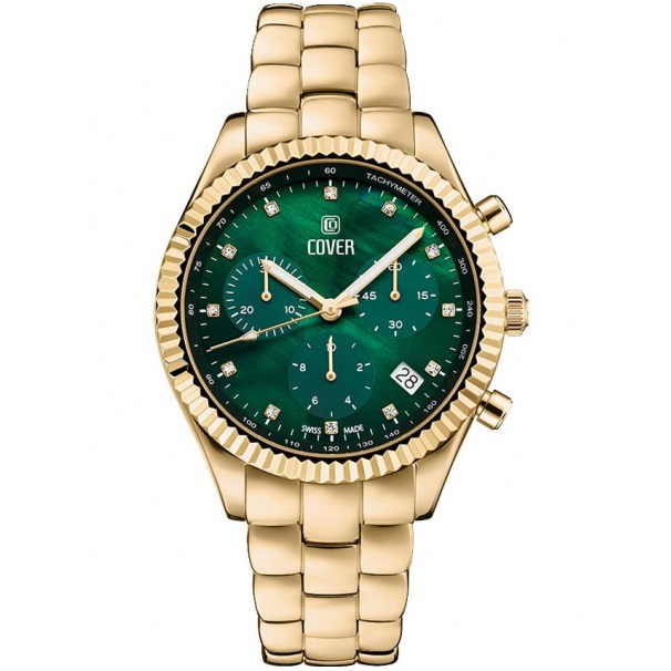 Модель Cover CO207.04 (также известная как Cover Valentina) — это женские швейцарские часы-хронограф, сочетающие спортивную функциональность с элегантным дизайном. Кварцевый механизм. Циферблат изумрудно-зеленый натуральный перламутр, декорированный кристаллами Swarovski в качестве часовых индексов. Диаметр корпуса 38 мм.. Сапфировое стекло, устойчивое к появлению царапин. Корпус и браслет изготовлены из нержавеющей стали (марка 316L) с золотистым PVD-покрытием.