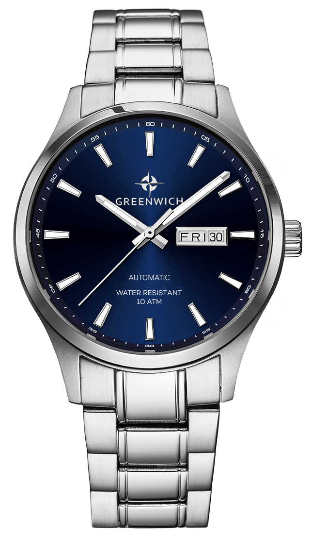 На фоне циферблата с полировкой и эффектом градиента расположились накладные риски и крупные стрелки. Они хорошо читаются при любых условиях освещения — люминесцентный состав, которым покрыты эти элементы, светится в темноте. В модели установлено минеральное стекло. Повышенная водостойкость составляет 10 атмосфер.