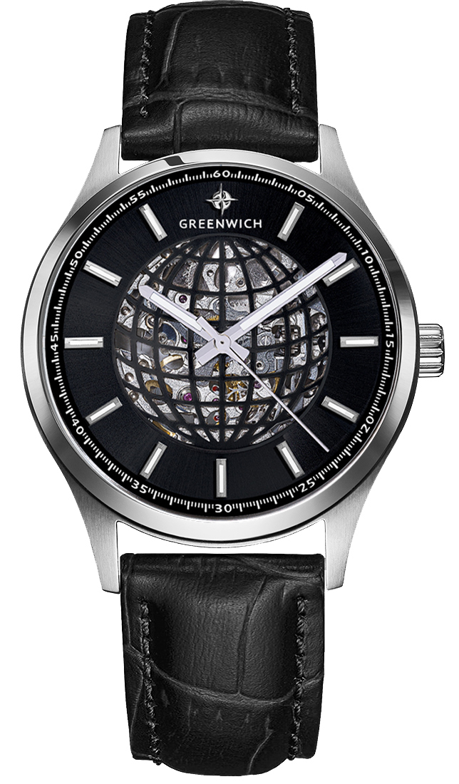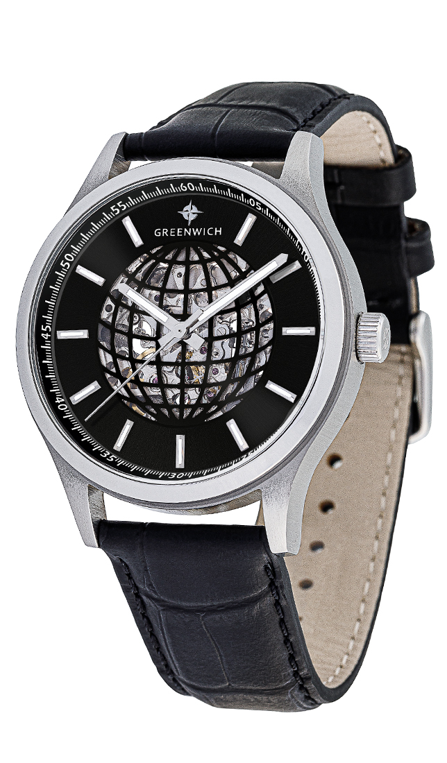 Часы-скелетон - это само по себе произведение часового искусства. А в серии Globe прозрачный циферблат украшает оригинальный элемент, линии параллелей и меридианов которого складываются в очертания глобуса. Задняя крышка модели тоже прозрачная, сквозь нее можно наблюдать за движениями ротора с традиционной уже для бренда гравировкой Good Luck и других деталей автоматического механизма Miyota. На пластине черного цвета закреплены накладные риски. Часовая и минутная стрелки выделены люминесцентным покрытием, которое обладает способностью светиться в темноте. Водостойкость часов Globe равна 10 атмосферам. Корпус модели сделан из нержавеющей стали, ремешок — из натуральной кожи черного цвета. Стальная застежка и удобная заводная головка декорированы логотипом бренда Greenwich.