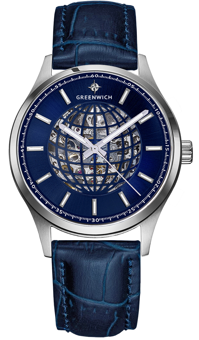 Часы-скелетон - это само по себе произведение часового искусства. А в серии Globe прозрачный циферблат украшает оригинальный элемент, линии параллелей и меридианов которого складываются в очертания глобуса. Задняя крышка модели тоже прозрачная, сквозь нее можно наблюдать за движениями ротора с традиционной уже для бренда гравировкой Good Luck и других деталей автоматического механизма Miyota. На пластине синего цвета закреплены накладные риски. Часовая и минутная стрелки выделены люминесцентным покрытием, которое обладает способностью светиться в темноте. Водостойкость часов Globe равна 10 атмосферам. Корпус модели сделан из нержавеющей стали, ремешок — из натуральной кожи синего цвета. Стальная застежка и удобная заводная головка декорированы логотипом бренда Greenwich.