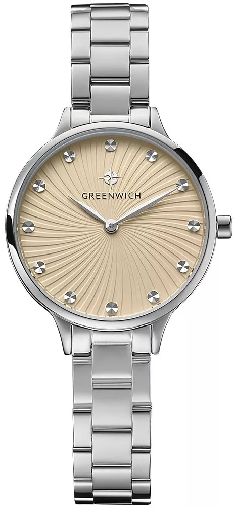 Рельефные лучи, расходящиеся из центра бежевого циферблата, создают впечатление вихря. А серебристые накладные индексы, имеющие множество граней, хорошо отражают свет — это позволяет точно определить время.