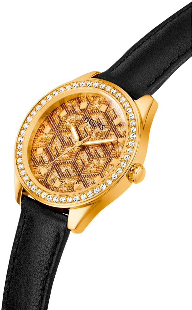 Женские часы с круглым стальным корпусом G Gloss. Метки в виде точек. Безель украшен кристаллами. Рифленая заводная головка. Кожаный ремешок с классической застежкой.