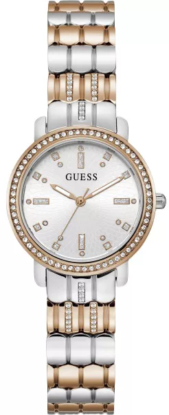 Женские часы с круглым стальным корпусом Hayley. Корпус, циферблат и браслет украшены кристаллами. Метки в виде точек и штрихов из кристаллов. Рифленая заводная головка. Стальной браслет с раскладывающейся застежкой.