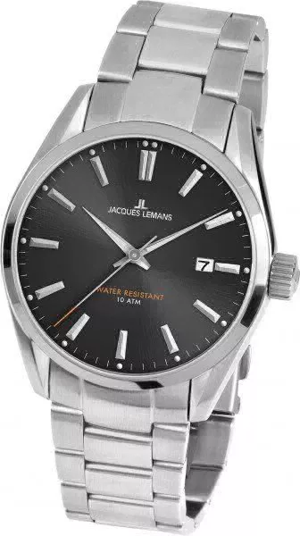 Тонкий стальной корпус мужских часов классической серии Jacques Lemans надежно защищает точный кварцевый механизм. Сразу привлекает внимание цвет полированного циферблата, выполненного в графитовом цвете. Помимо индикации времени (часовая, минутная, секундная стрелки), в положении «3» часа расположен индикатор даты. Обратите внимание на водостойкость. В данной модели она повышенная и составляет 10 АТМ. Часы дополняет стальной браслет.