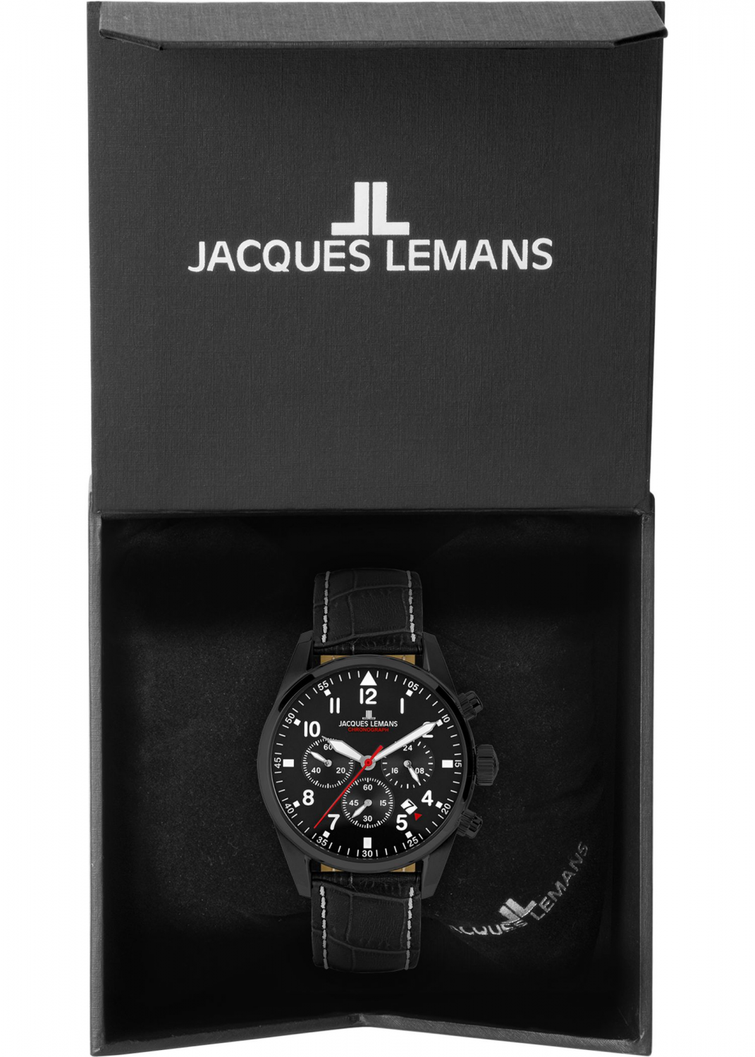 Мужские наручные часы-хронограф с секундомером. 12-ти и 24-х часовой формат времени. Круглый стальной корпус с полированными и сатинированными поверхностями. Мечевидные стрелки в стиле Sword. Метки в виде арабских цифр и штрихов. Стрелки и метки с люминесцентным покрытием, которое светится в темноте после непродолжительной зарядки на свету. Окошко даты находится между часовыми отметками 4 и 5. Рифленая заводная головка. Текстурированный кожаный ремешок с классической застежкой.