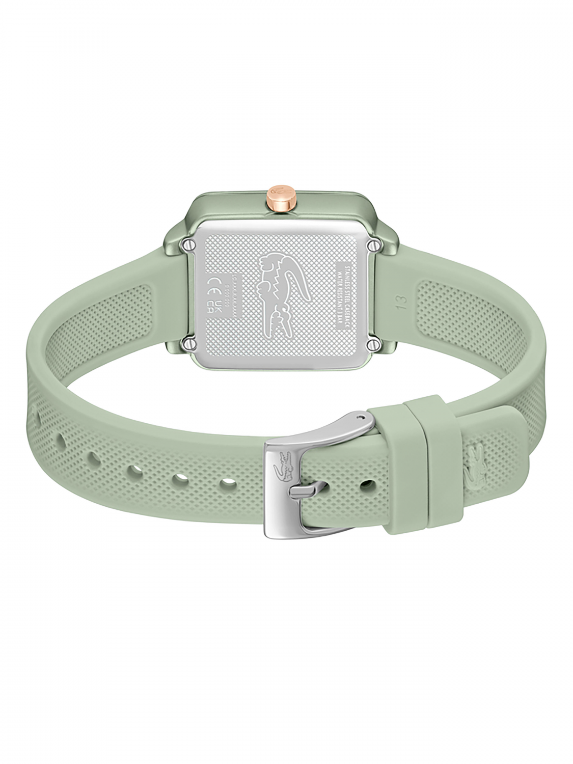 Изящный минималистичный дизайн квадратного циферблата с едва заметным рисунком Хлóпка Пикé – ДНК Lacoste.12.12 Flow. Женские элегантные кварцевые часы,выполненые в нежном зеленом тоне.Минеральное стекло. Ремешок выполнен из гипоаллергенного и термостойкого силикона. Водостойкость 3 АТМ.