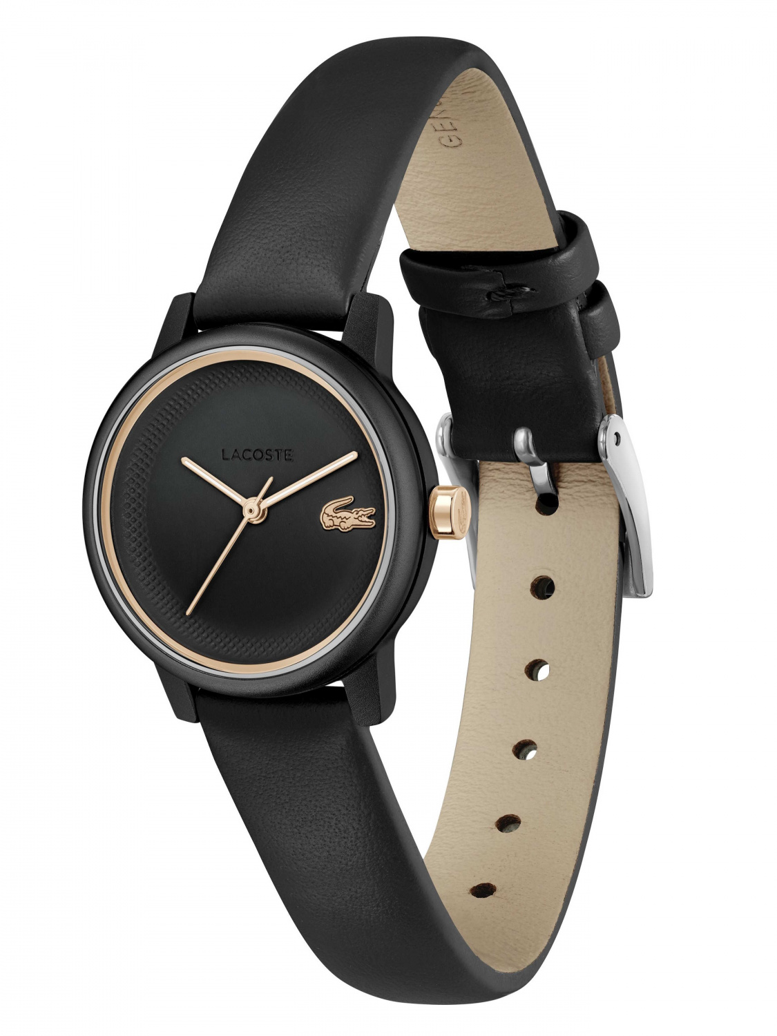 Черный циферблат с логотипом бренда защищен минеральным стеклом.