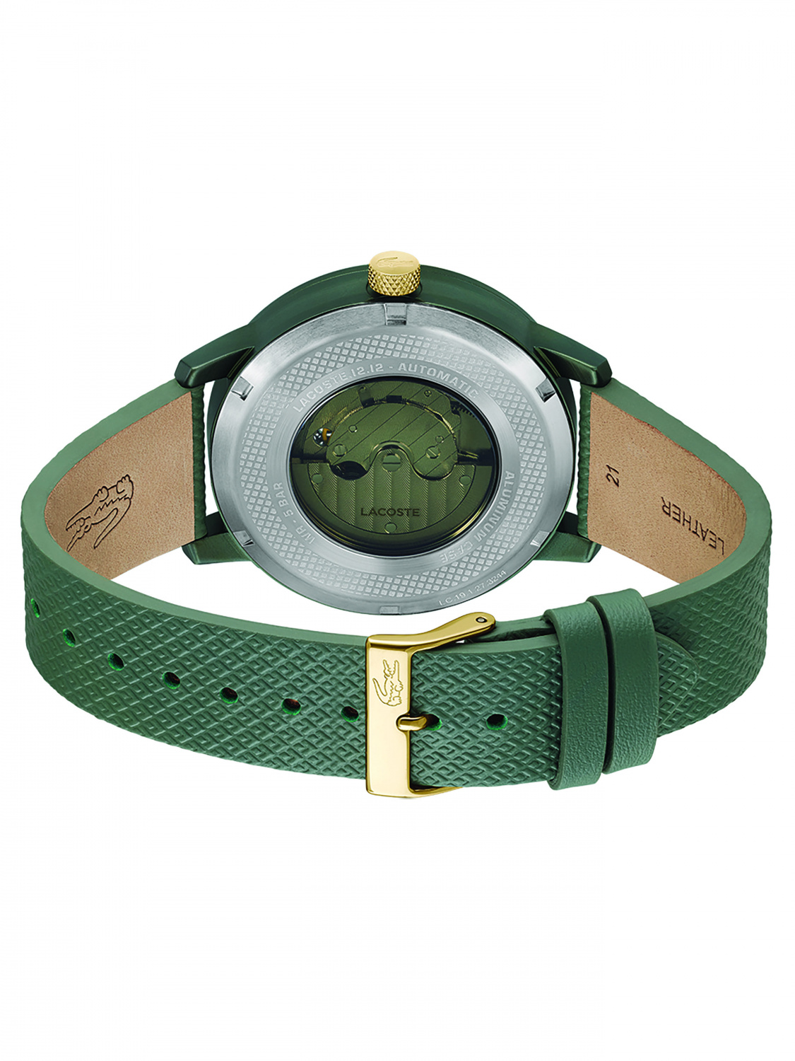 Круглый алюминевый корпус с IP покрытием. Циферблат с логотипом бренда защищен минеральным стеклом устойчивым к появлени. царапин. Циферблат: Зеленого цвета с вырезом в форме фирменного крокодила, через который видна работа механизма. Задняя крышка также прозрачная.
