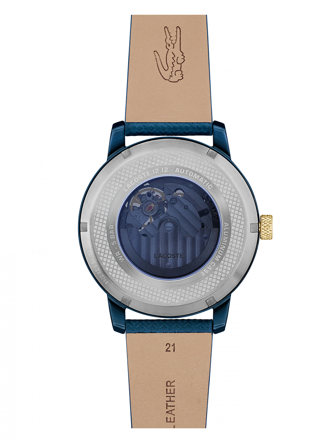 Круглый алюминевый корпус с IP покрытием. Минеральное стекло устойчивое к появлению царапин. Синий циферблат типа «open heart» с отверстием в форме крокодила, через которое видна работа механизма.