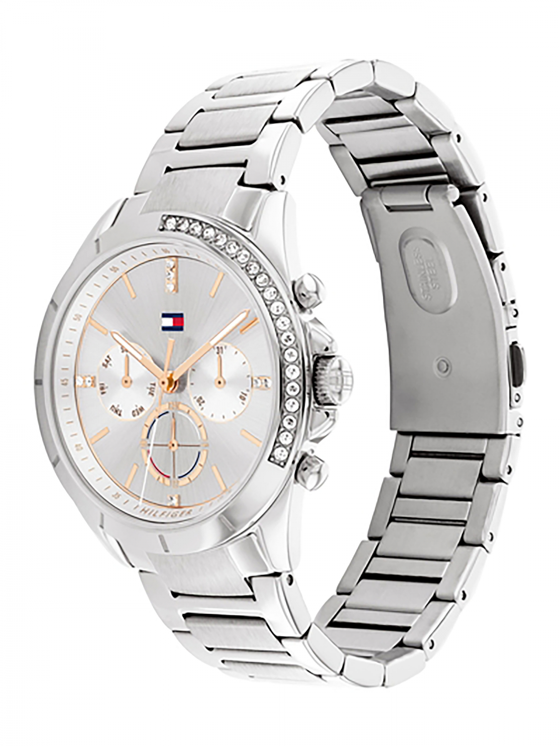 Женские кварцевые часы из коллекции Kennedy. Круглый стальной корпус. Циферблат с метками в виде штрихов. 12-ти и 24-х часовой формат времени. Дата и день недели вынесены на отдельные циферблаты. Минеральное стекло.Браслет с раскладной застежкой.Водозащита 5 АТМ/bar.