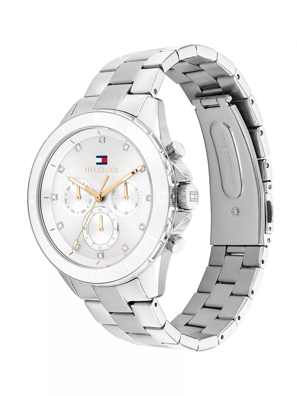 Женские кварцевые часы из коллекции Mellie. Круглый стальной корпус.12 и 24 часовой формат времени. Дата и день недели вынесены на отдельные циферблаты. Циферблат с метками в виде точек- кристаллов.Минеральное стекло. Корпус и браслет из нержавеющей стали. Браслет с раскладной застежкой. Водозащита 5 АТМ.