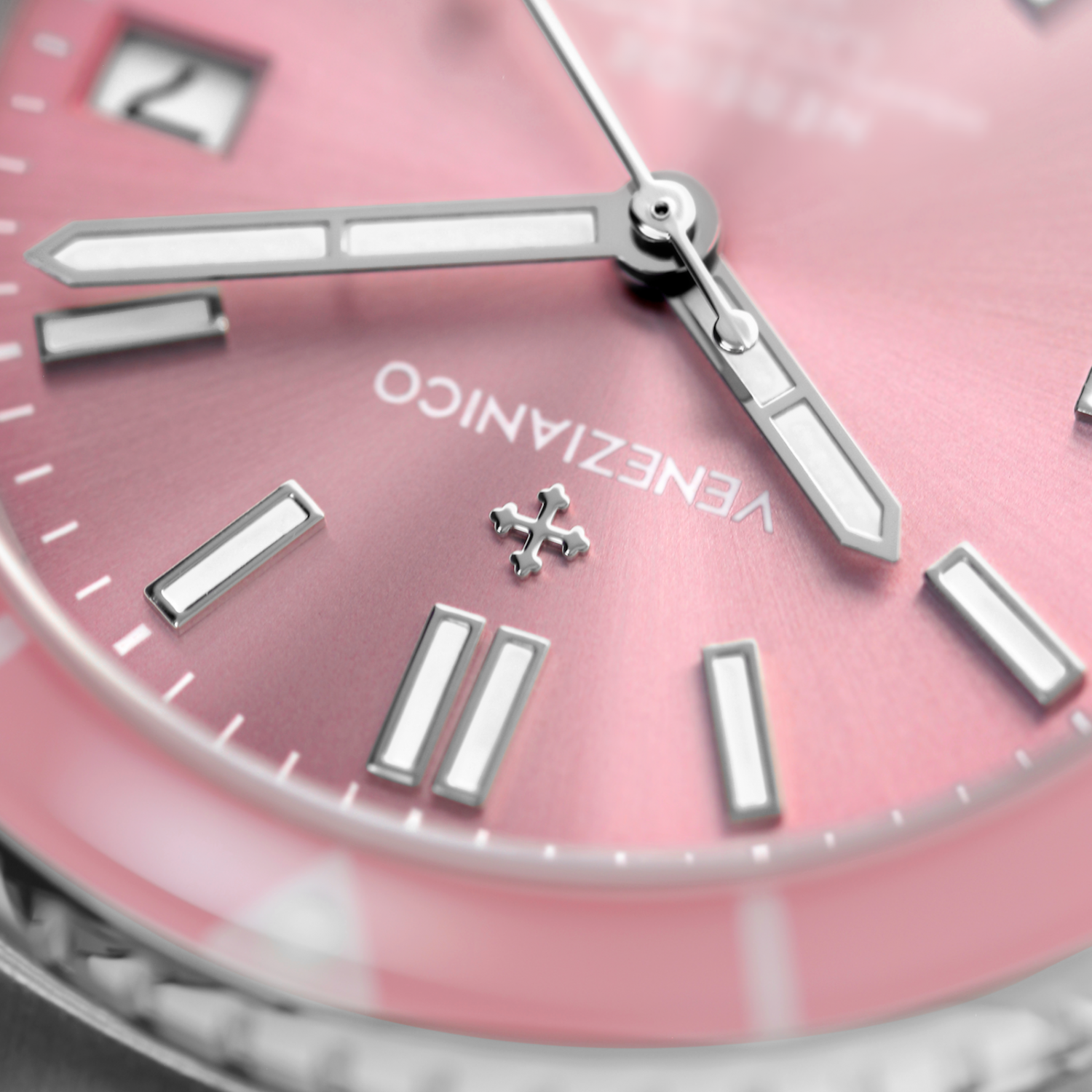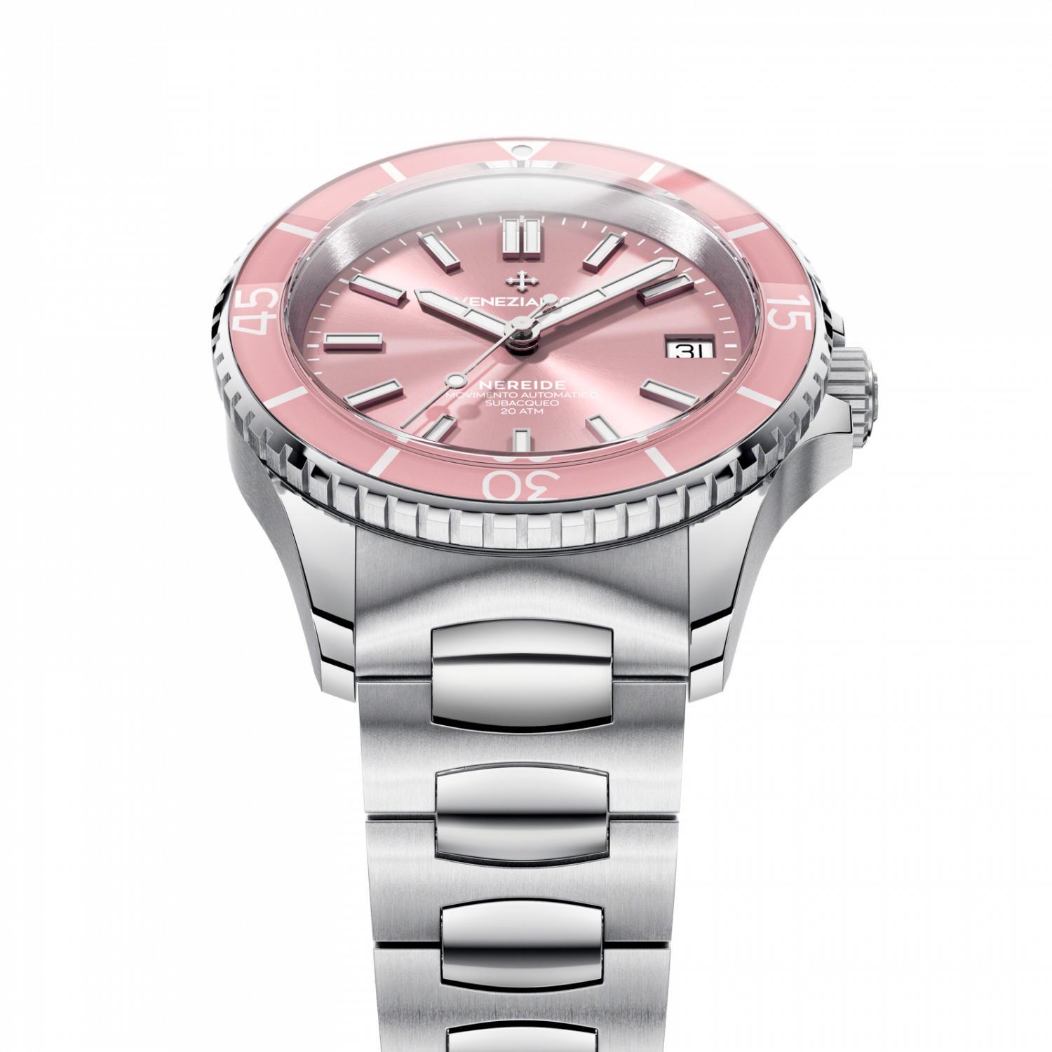 Сочетание спортивных и элегантных ноток способно покорить даже самую искушенную девушку. Nereide 39. Женские часы. Вдохновением на создание коллекции послужила подводная лодка итальянского королевского флота Nereide, которая была построена в 1913 году на военно-морской верфи Венеции. В механизме 24 камня, частота 21600 полуколебаний в час. Запас хода 41 час. Возможность ручного завода. Циферблат с метками в виде штрихов выполнен по технологии Sunray (солнечные лучи). Окошко даты находится в положении 3 часа. Безель со стеклянной вставкой BK7 вращается на 120 щелчков в одном направлении. Задняя крышка крепится на 6-ти винтах и украшена выгравированным изображением подводной лодки Nereide. Индивидуальный серийный номер. Завинчивающаяся заводная головка с защитой. Браслет Canova с раскладывающейся застежкой. Для изготовления данного браслета требуется 16 различных форм.