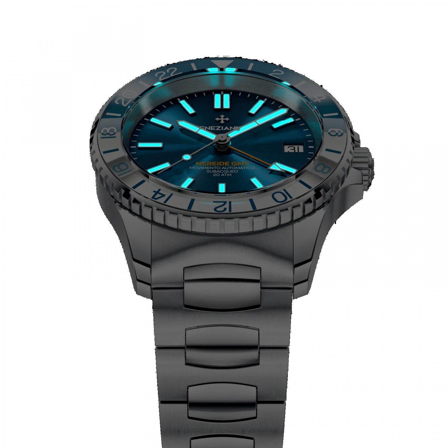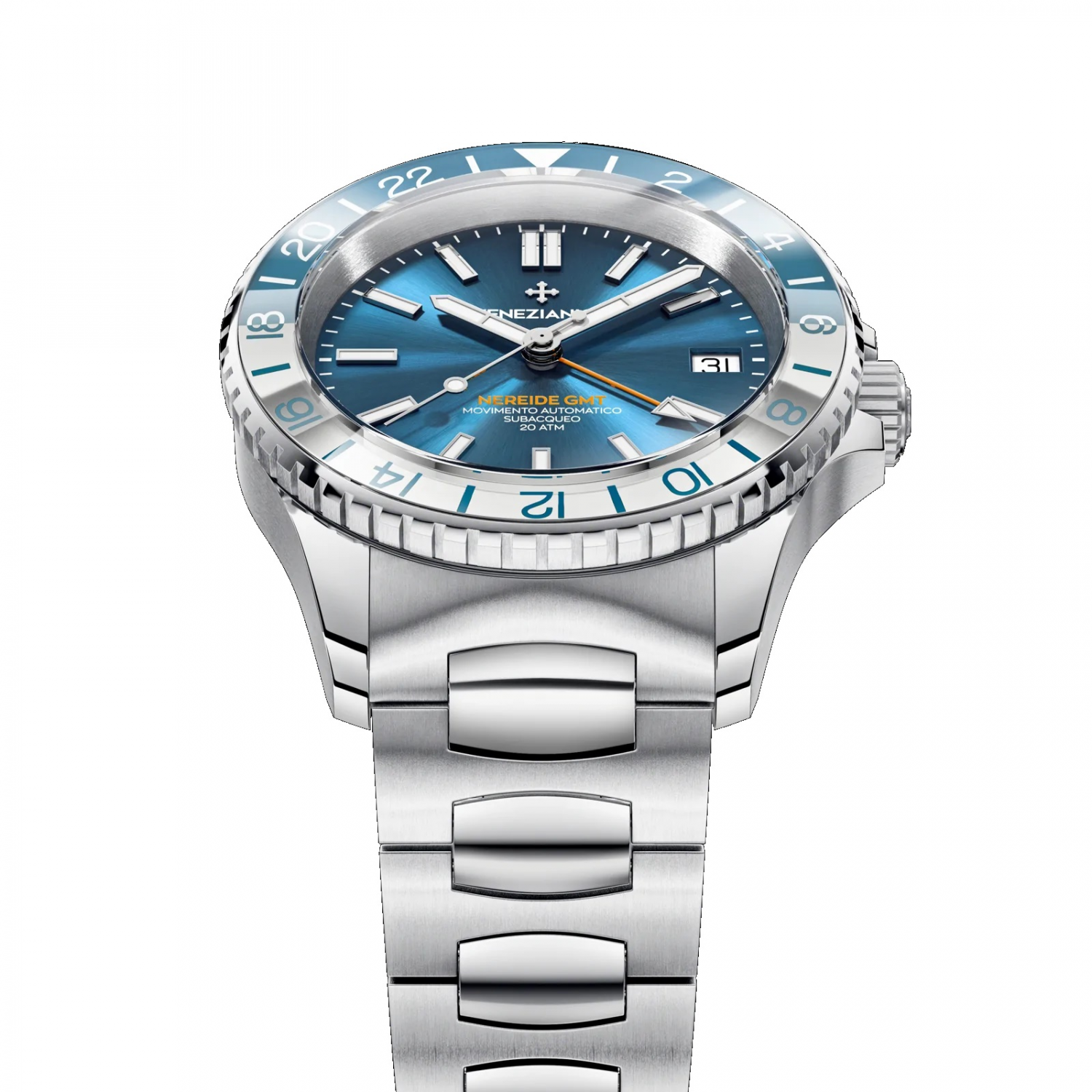Удобный мужской аксессуар с надежным автоматическим механизмом не позволит упустить ни одной важной минуты вашего времени. Nereide GMT. Мужские дайверские часы с круглым корпусом. Часы вдохновлены одним из последних чудес венецианской военно-морской техники — подводной лодки Nereide. Вращающийся безель. Функция GMT. В механизме 24 камня, частота 21600 полуколебаний в час. Запас хода 41 час. Возможность ручного завода. Циферблат с метками в виде штрихов выполнен по технологии Sunray (солнечные лучи). Окошко даты в положении 3 часа. Задняя крышка крепится на 6-ти винтах и украшена выгравированным изображением глобуса. Индивидуальный серийный номер. Рифленая заводная головка с защитой. Браслет Canova с раскладывающейся застежкой. Для изготовления данного браслета требуется 16 различных форм.